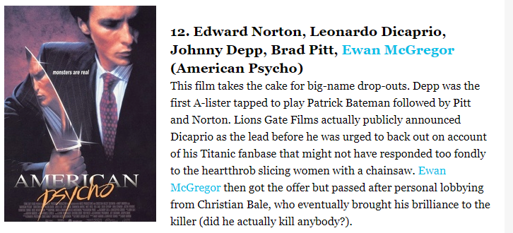 3. Christian Bale played Patrick Bateman in American Psycho after 5, five, FIVE other big names passed it up.