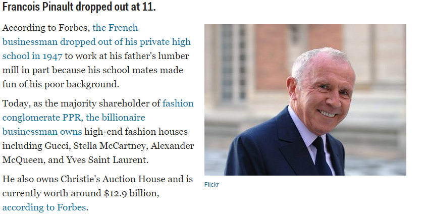 He was picked on because his family was poor. He now owns Christie’s Auction House and he’s worth $12.9 billion dollars. Find this and more successful dropouts at: Business Insider