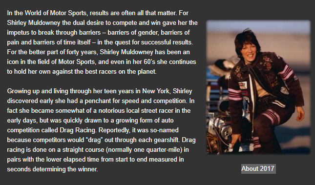 As a girl, I remember watching a movie about Shirley Muldowney. I was enamored. I would pretend to out-race all the great racers and the bad guys using a plate as a steering wheel and my twirling baton as a shifter. Let me tell you, it’s easy to be fast in your imagination.